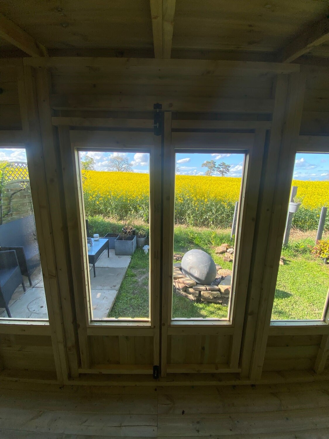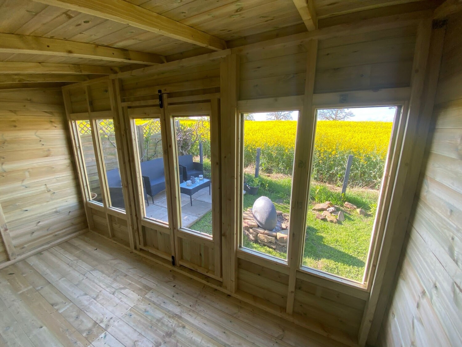 The summerhouse has 4ft wide 6ft high double door and 6 long windows.