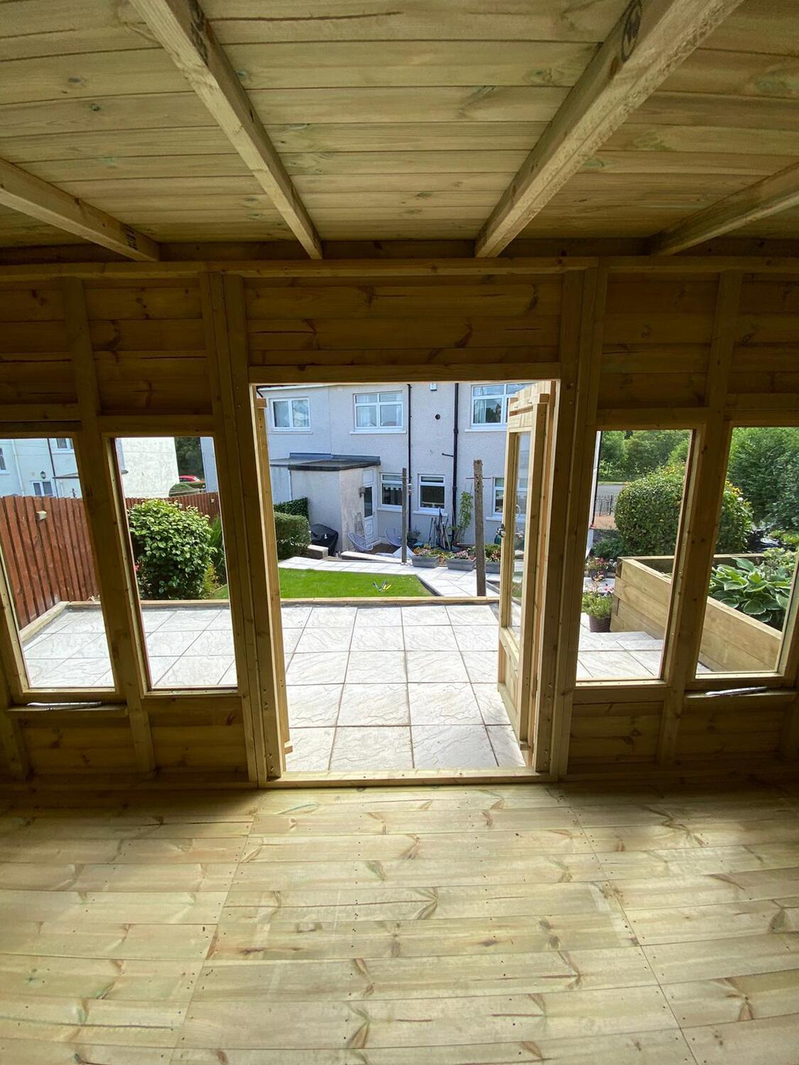 The summerhouse is 14ft wide at the front where the doors and 8ft deep.