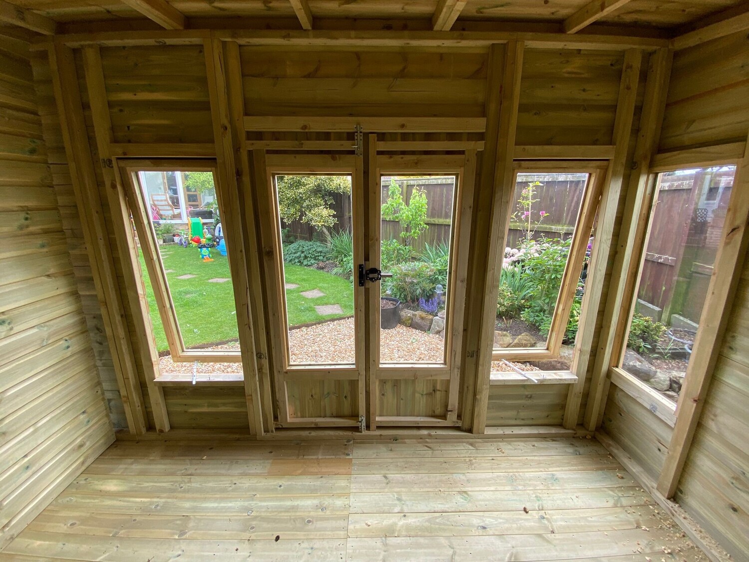 The summerhouse has 6 long windows, 2 of which are opening & 3 standard opening windows.