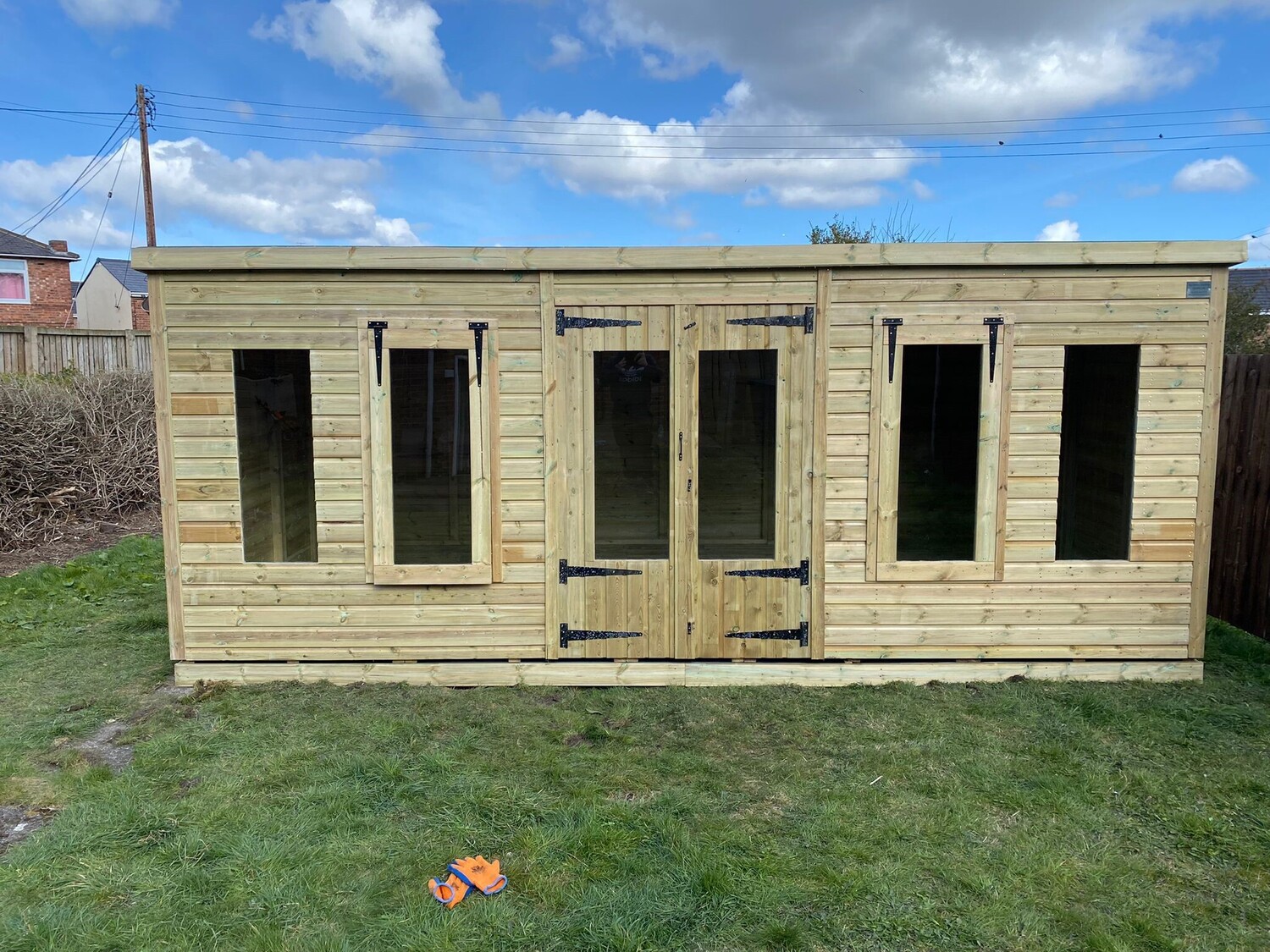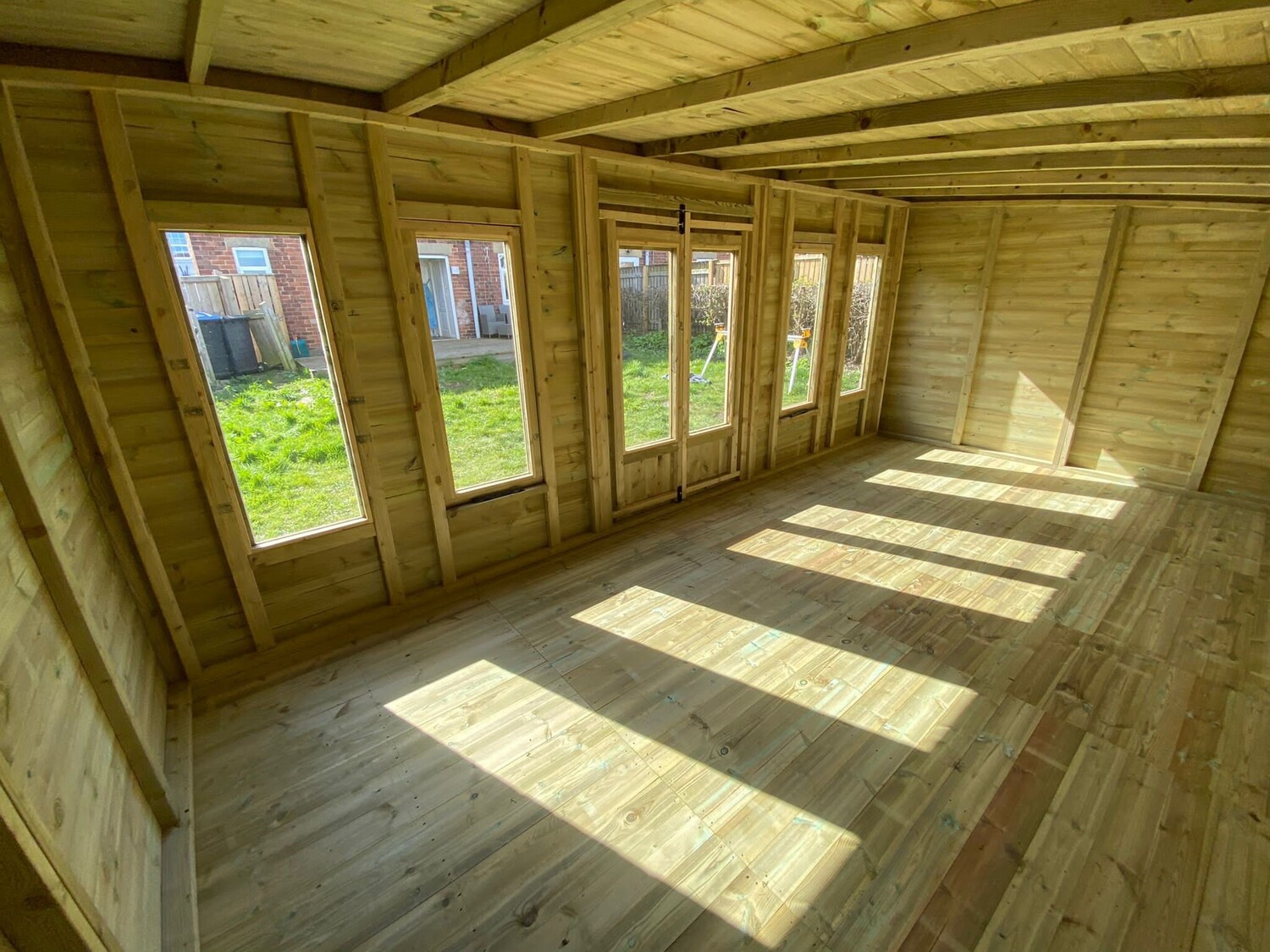 The summerhouse has 4ft wide 6ft high double door and 6 long windows, 2 of which are opening.
