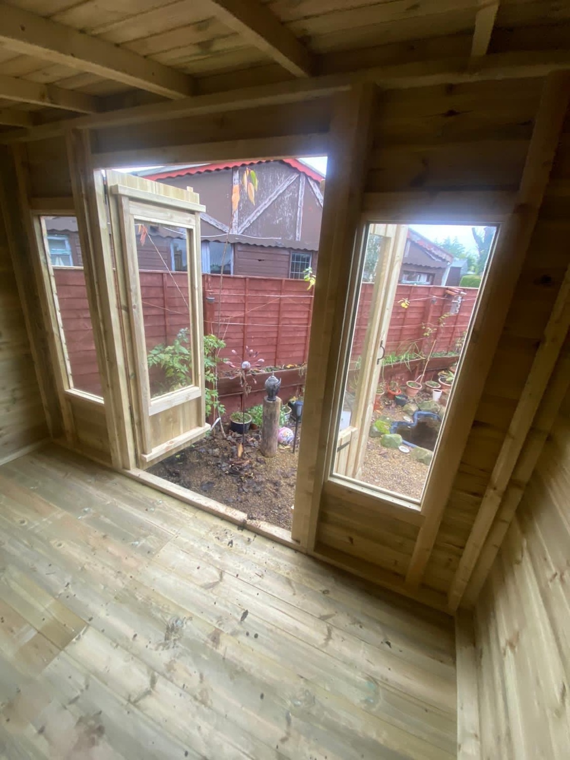 The summerhouse has 4ft wide 6ft high double door and 4 long windows.