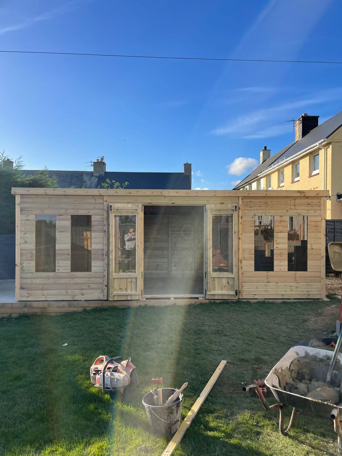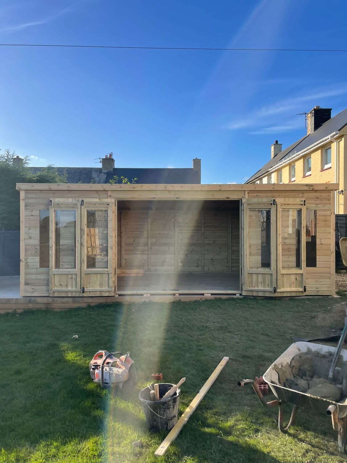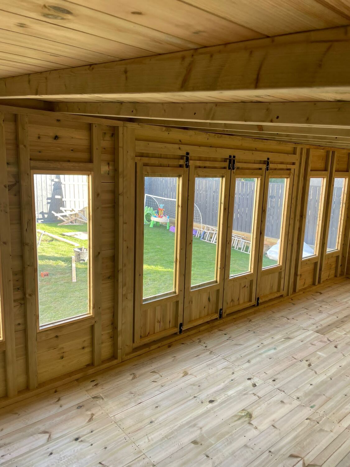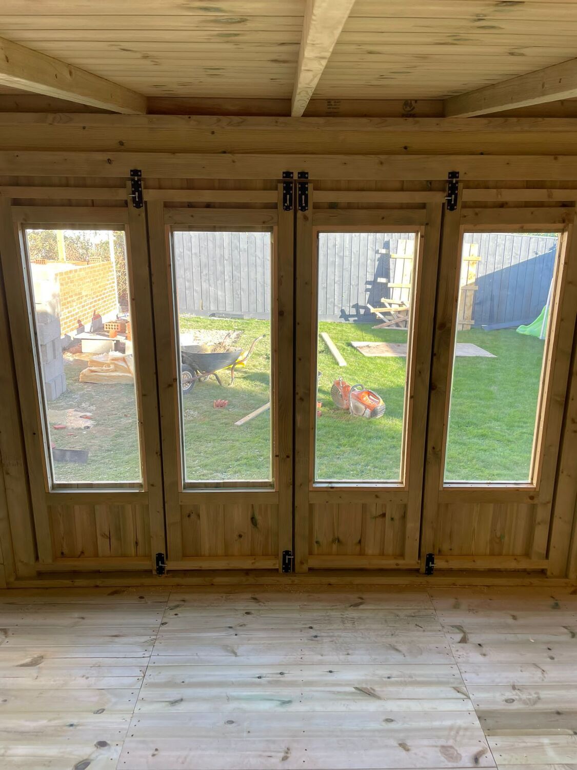 The summerhouse has 8ft wide bifold doors and 8 long windows.