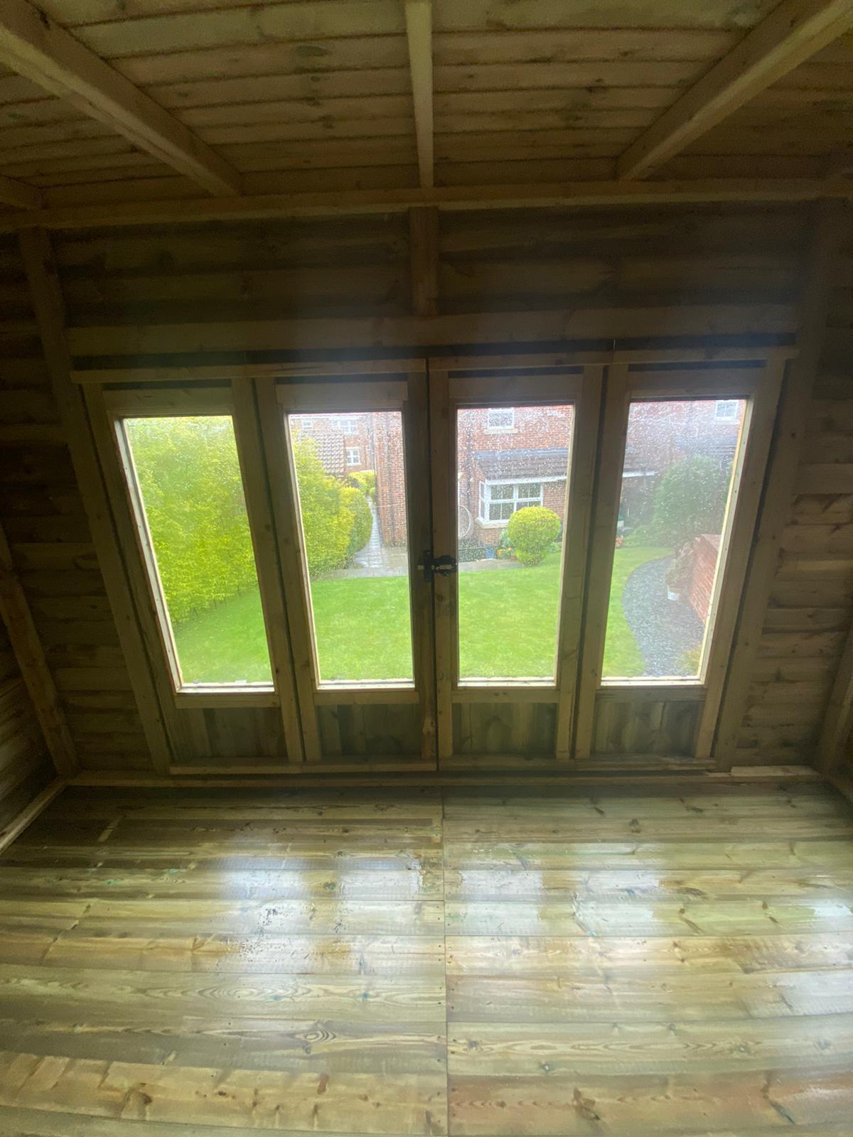 The summerhouse has 8ft wide 6ft high bifold doors, 5 long windows, 1 of which is opening.