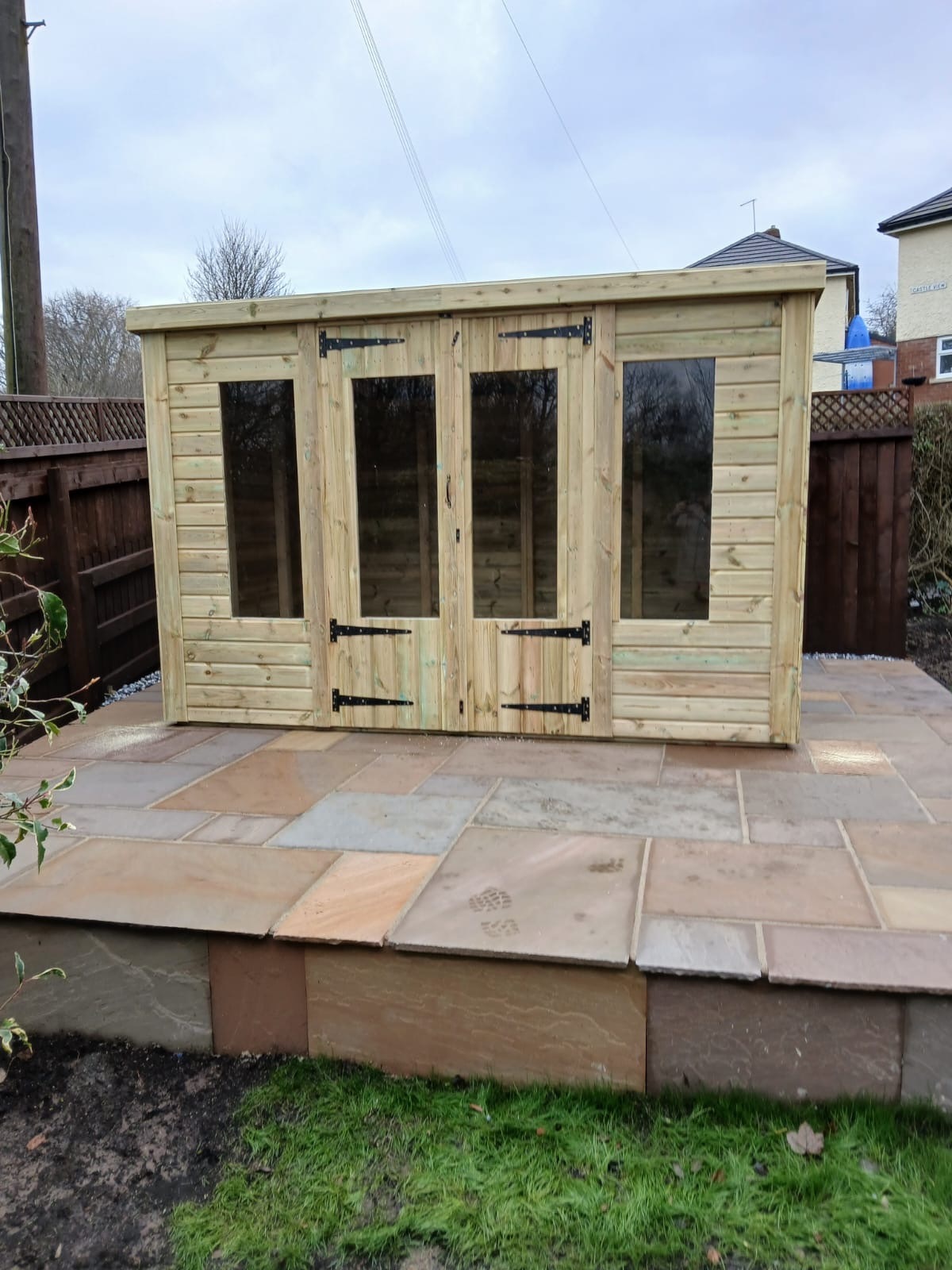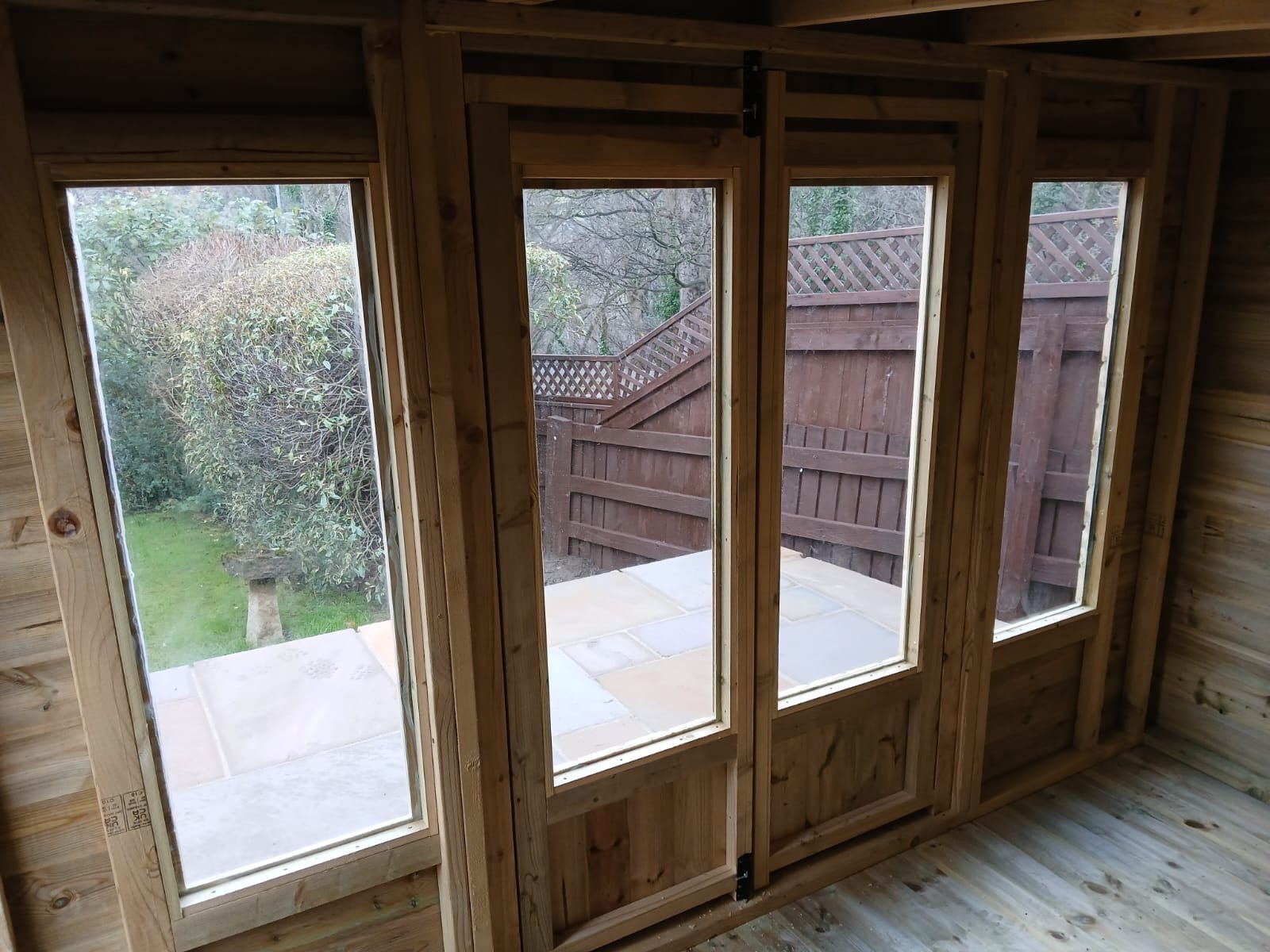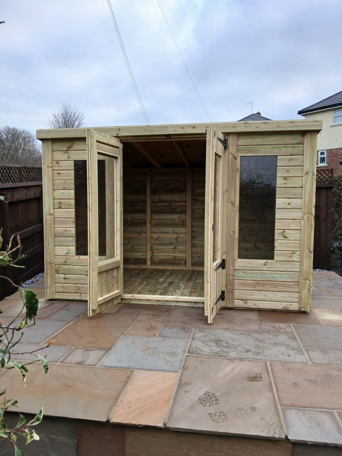 The summerhouse has 4ft wide 6ft high double door and 5 long windows.