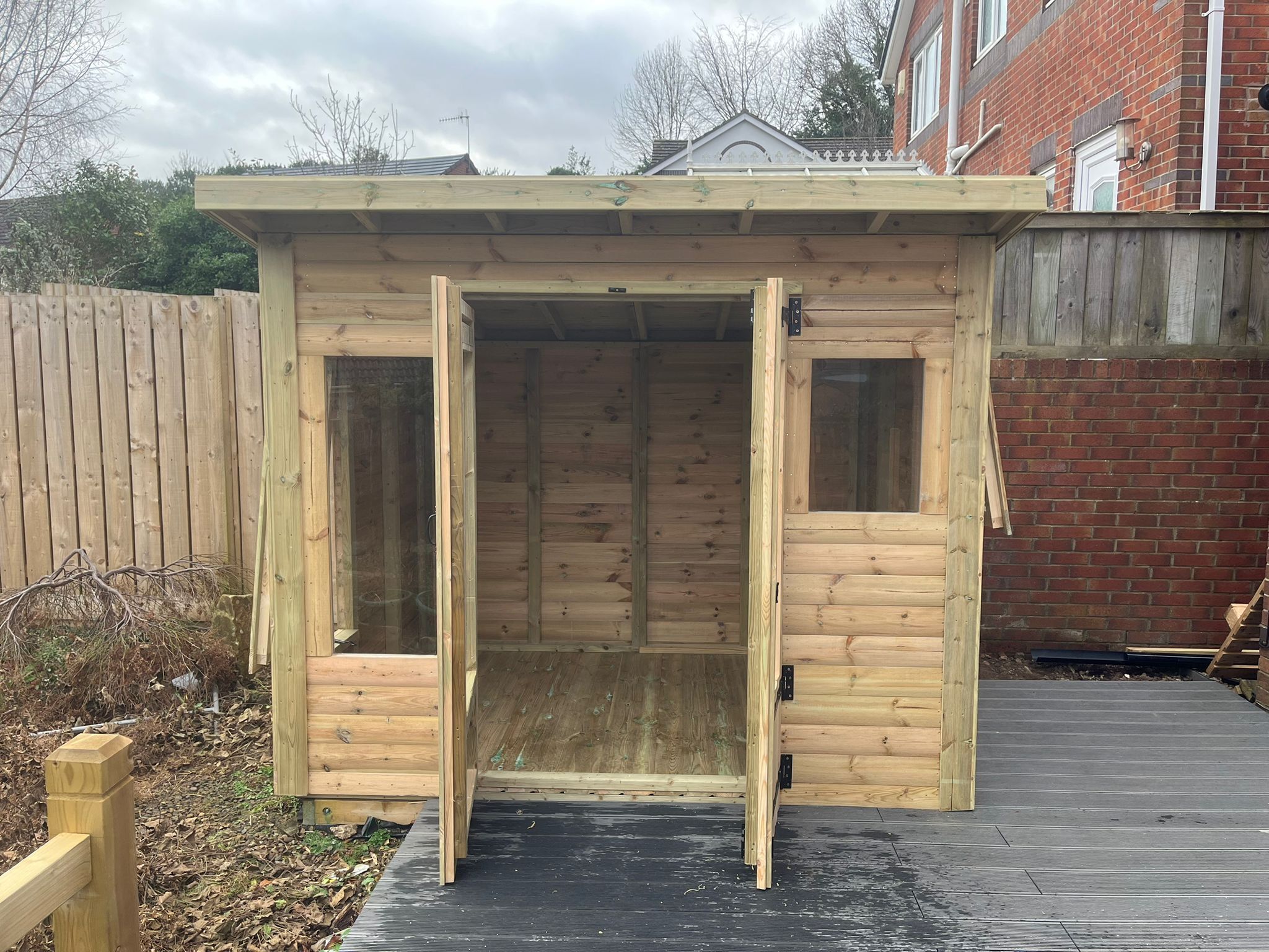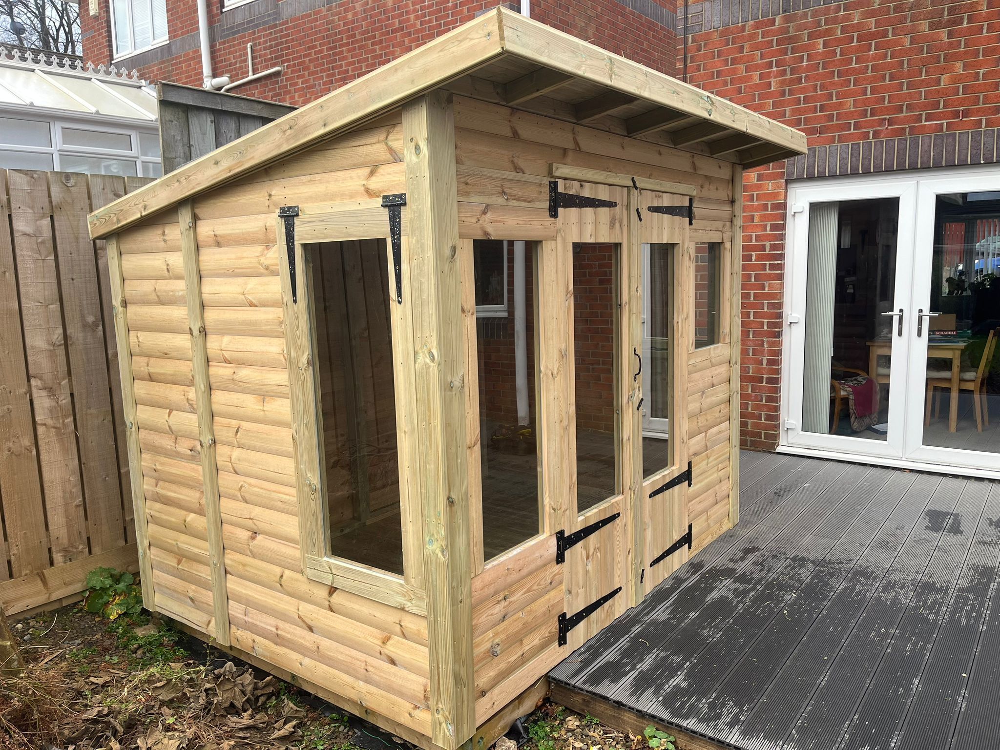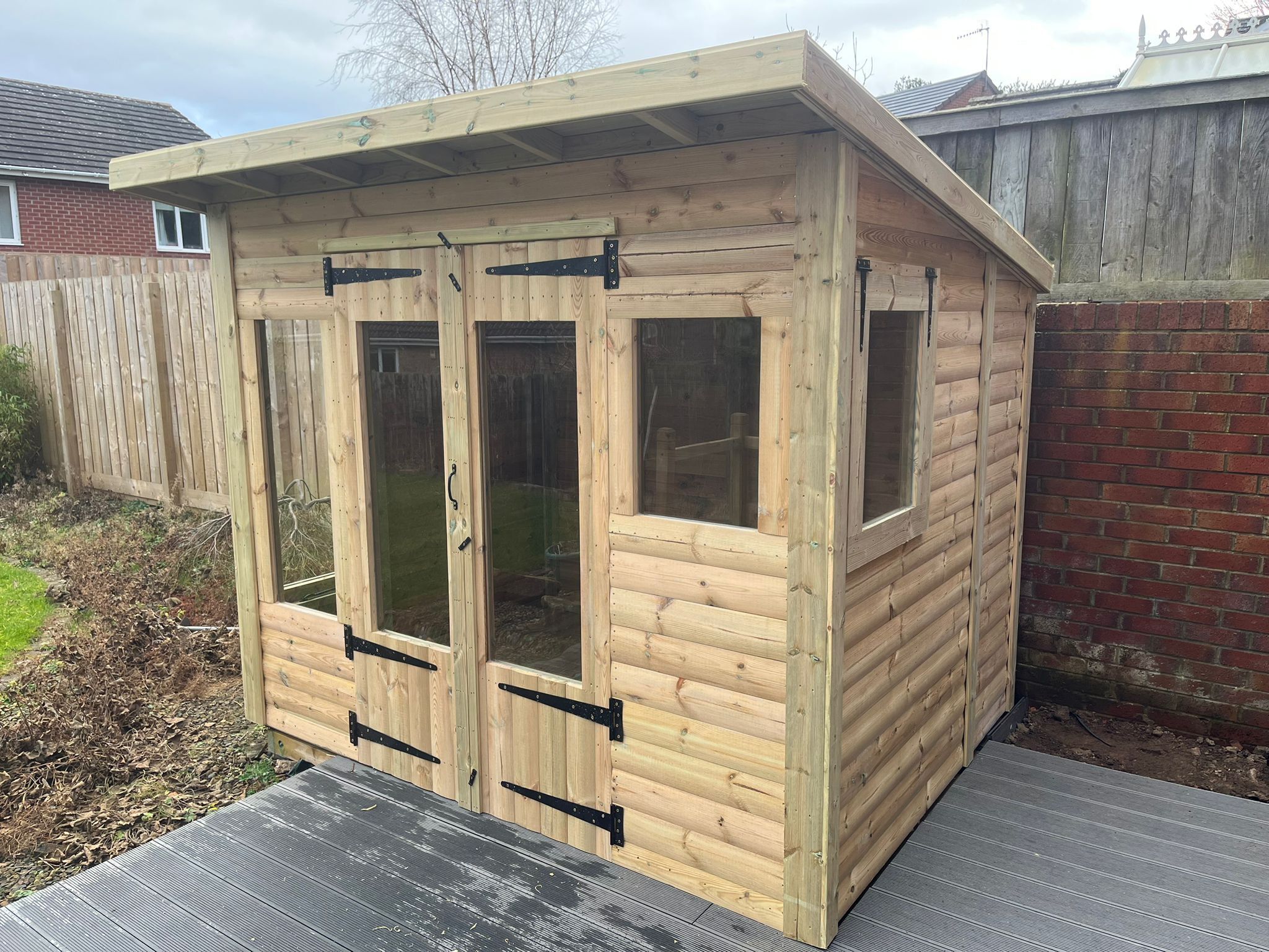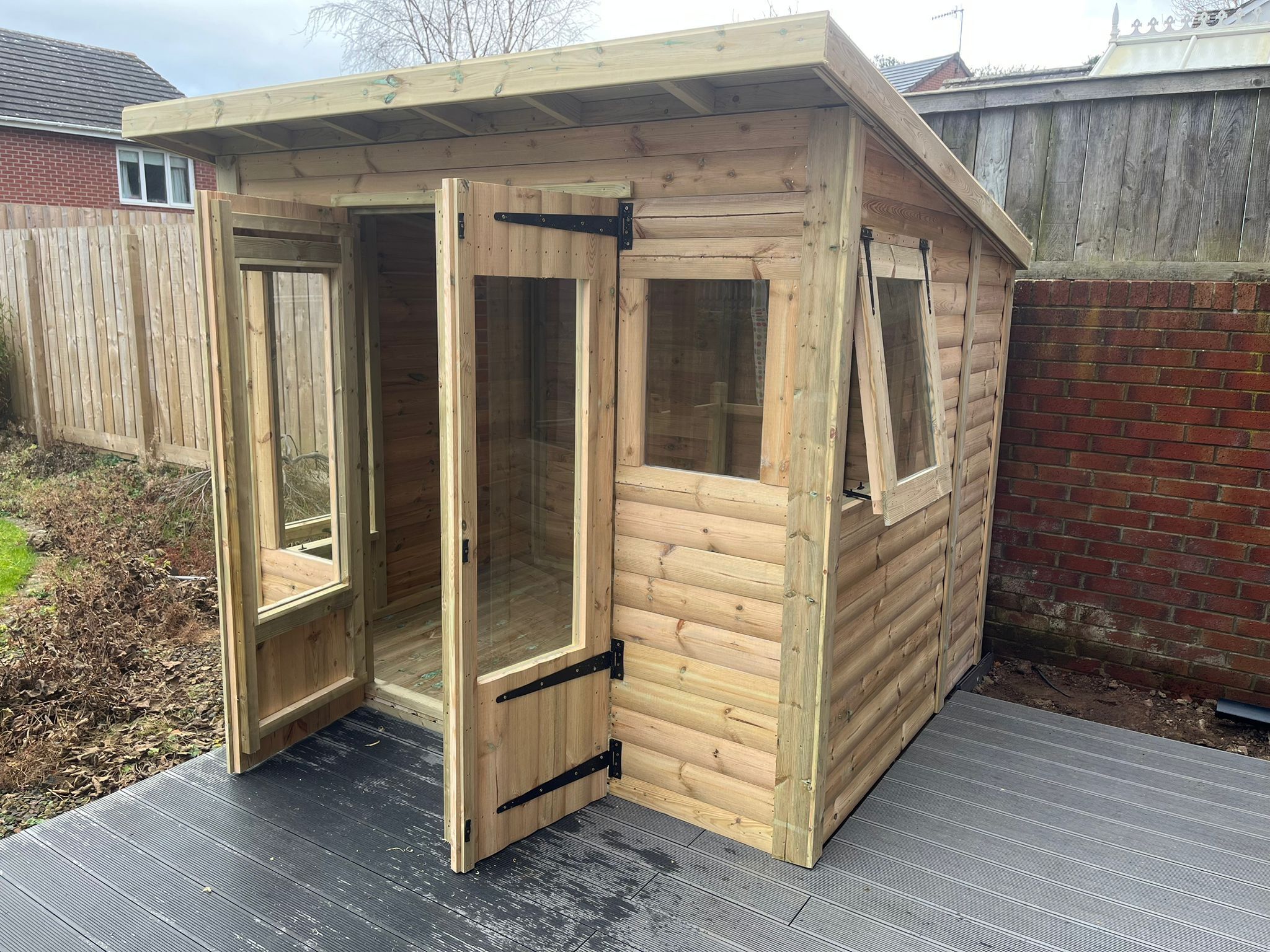 8x6 pent roofed summerhouse in our tanalised 28mm T&G loglap.