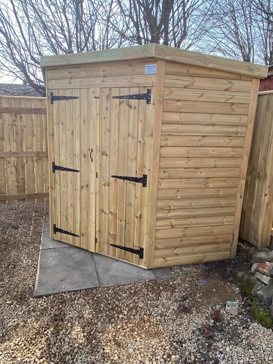 The shed has a 4ft wide 6ft high double door and no windows. 2 standard windows can be added at no extra cost.