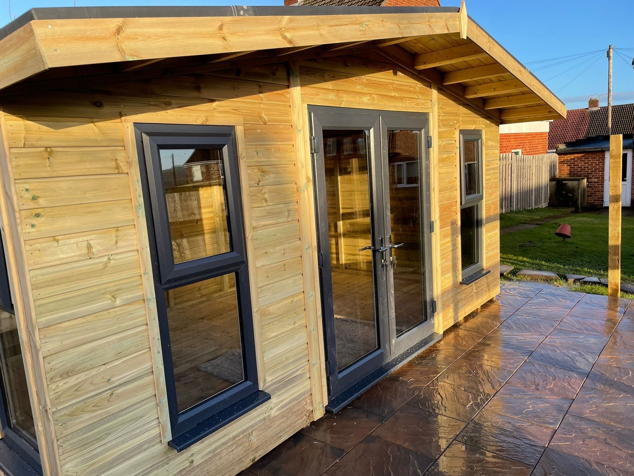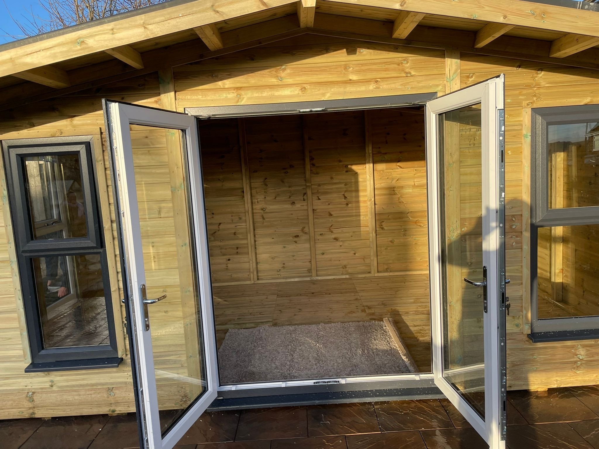 The summerhouse has a 1980 x 1600 wide pvc double glazed door and x4 600 x 1500 opening pvc double glazed windows.