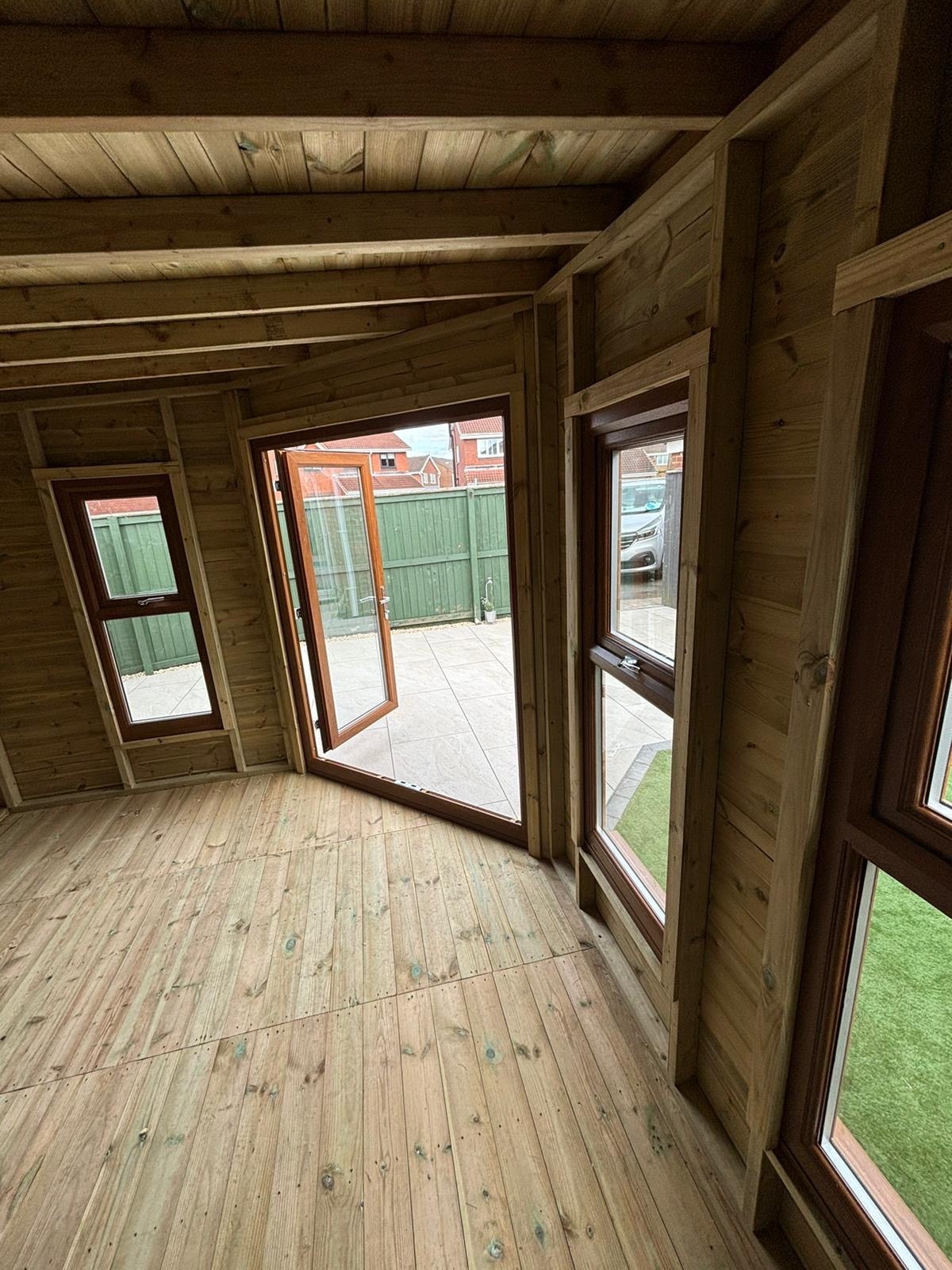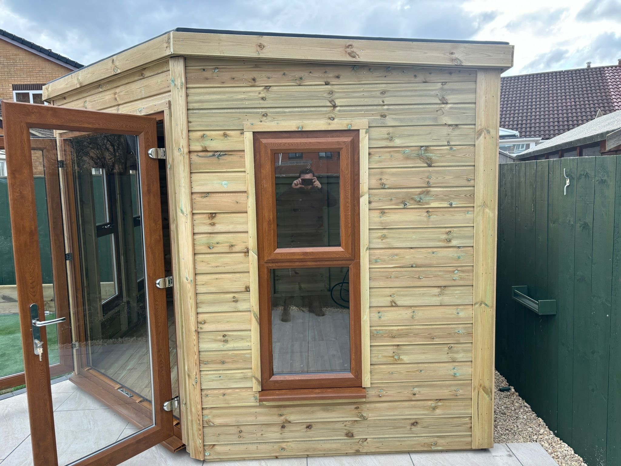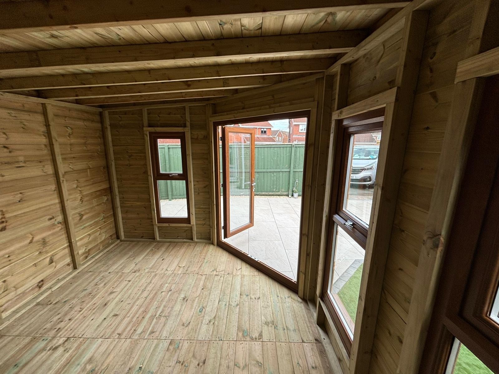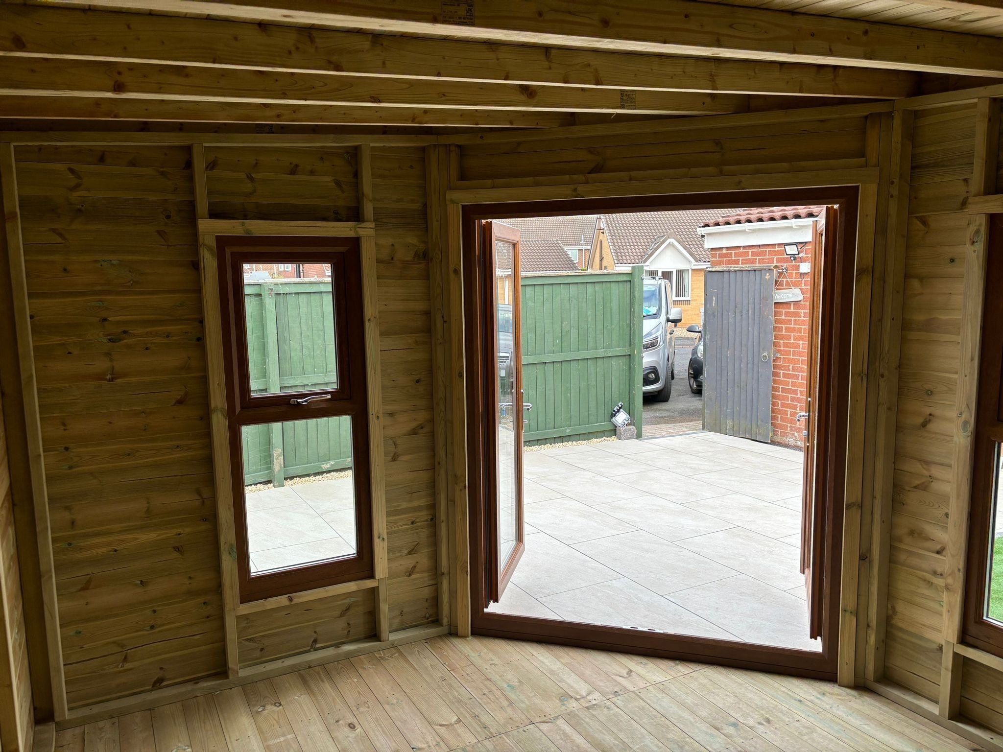 The summerhouse has a 1980 high x 1600 wide pvc double glazed door and x3 600 x 1500 opening pvc double glazed windows in the colour OAK.